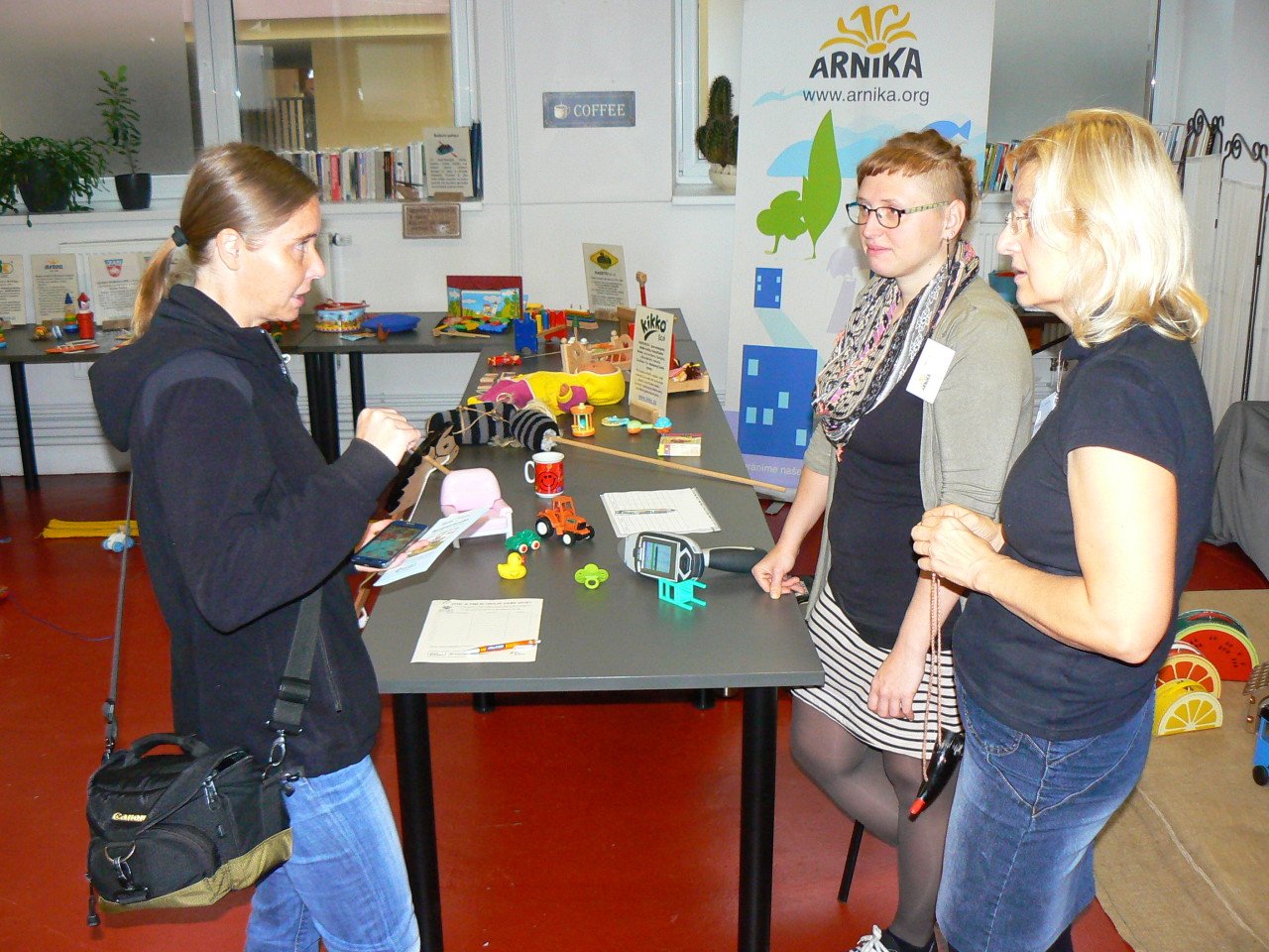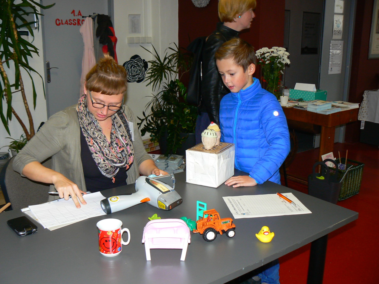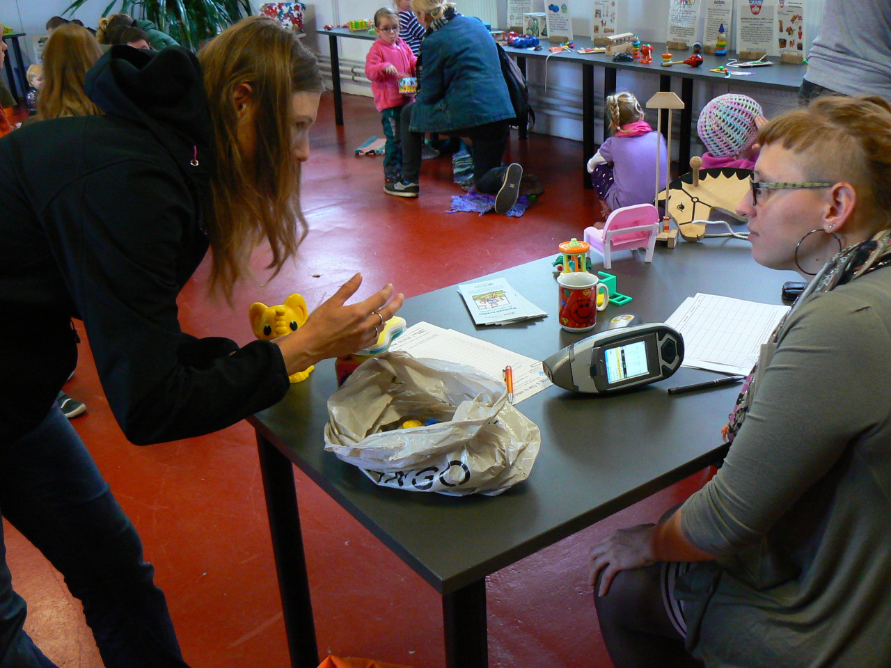 V sobotu 17. října jsme na výstavu hraček pozvali organizaci Arnika, která vlastní přístroj na měření předmětů (například hraček), zda ve svém materiálu, barvě nebo potisku obsahují nebezpečné látky. Pomocí rentgenového spektrometru jsme například odhalili, že na hrnečku byla použita červená barva s obsahem olova, která se navíc olupovala a tak se mohla dostat člověku přímo do těla, v plastové kačence se vyskytovalo PVC, u kterého je možné, že obsahuje jeden z nebezpečných ftalátů negativně působící na lidské zdraví.