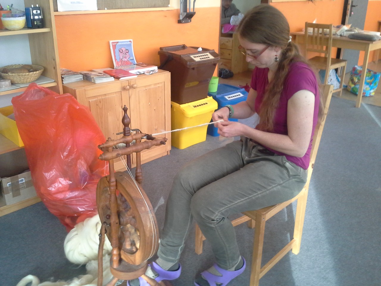 A to pěkně od začátku krůček za krůčkem od surové nastřihané vlny z ovečky. Na začátek jsme se dozvěděli něco zajímavého z teorie, ale pak už přišly ruční práce: vyprání špinavé vlny tak, aby se nesrazila, její barvení, vyčesání, předení na vřetánku i kolovrátku nebo suché či mokré plstění.